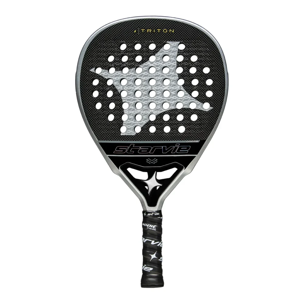 La StarVie Tritón Pro 2025 es una pala de pádel de alta gama, diseñada con un molde en forma de lágrima que desplaza el balance hacia la cabeza, lo que la convierte en una pala enfocada en la potencia. Este modelo, de la línea premium de StarVie, destaca por su elegancia con un diseño en negro y detalles en plata que incluyen el marco, el logo en el plano y el logo de la estrella en el corazón de la pala. Es una herramienta ideal para los jugadores que buscan dar un salto en su juego con una pala que ofrece tanto potencia como control.
